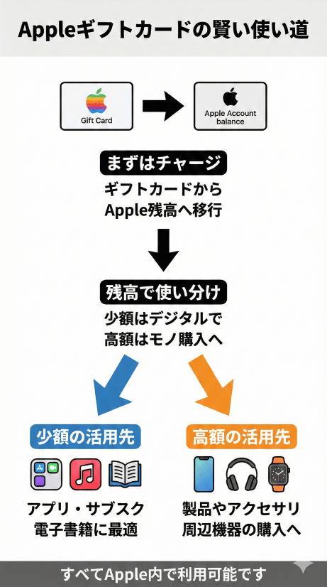これにより、少額のカードでは購入できなかった高額なアプリやコンテンツ、あるいはApple製品の購入費用の一部として充てることができます。