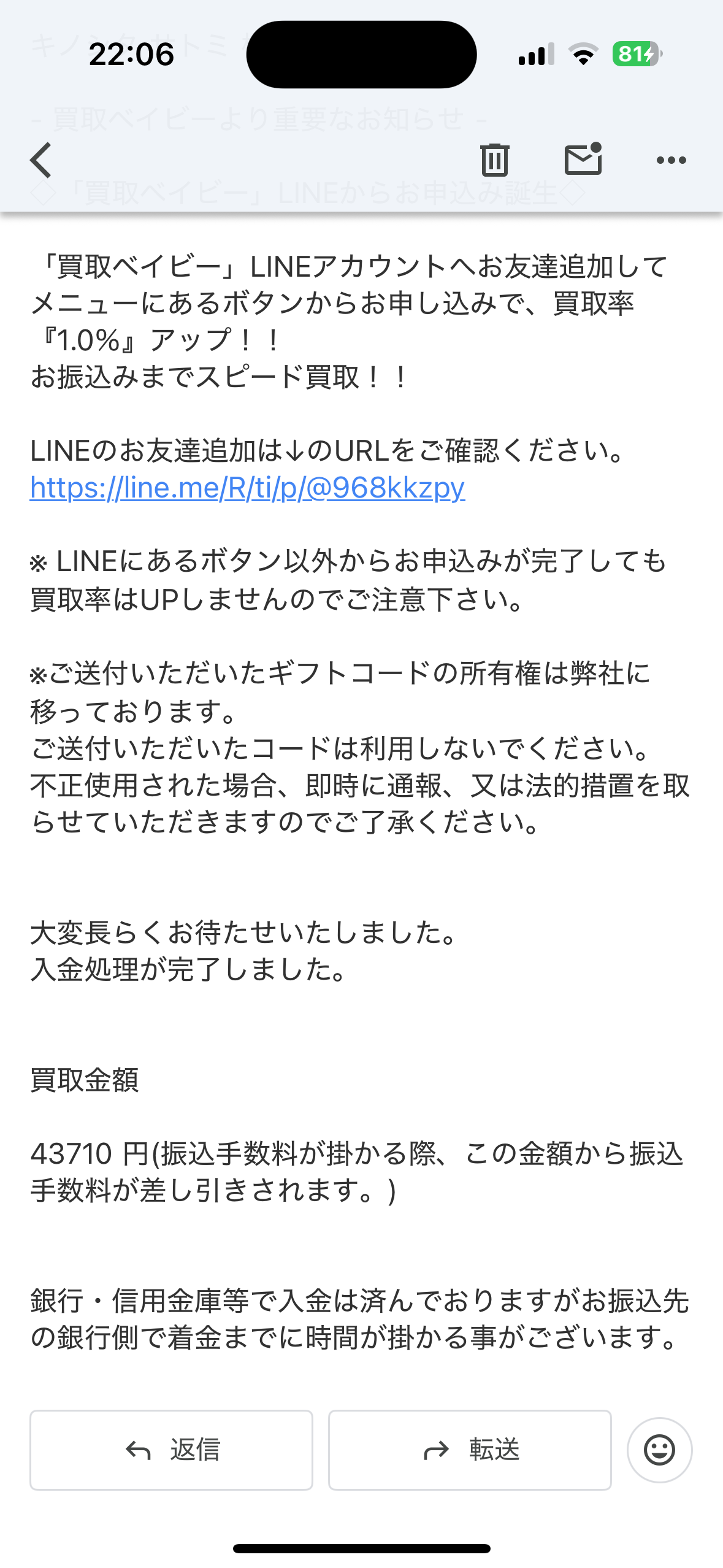 夜中に申し込みましたが、数時間でちゃんと振り込まれました。いらないギフト券を高価買取してくれるのでリピートします。