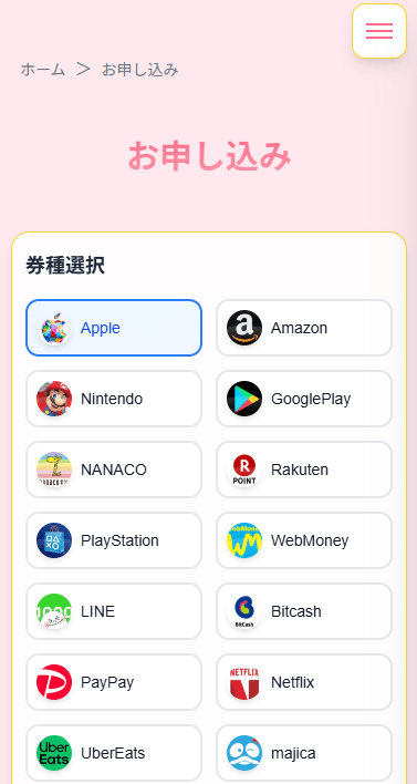 Amazonギフト券やAppleギフトカードをはじめ、20種類以上のギフト券に対応しています。