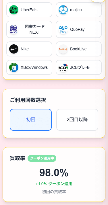 | ギフトカード | 初回買取率 | 2回目以降の買取率 |