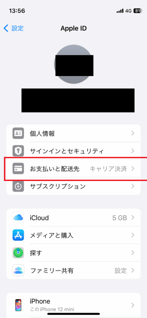 AppleID画面の「お支払い方法と配送先」をタップし、現在のAppleIDの支払い方法を確認します。