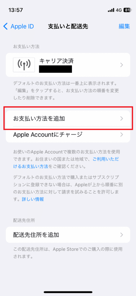 「お支払い方法の追加」をタップし、AppleIDの決済に使える支払い方法を追加します。
