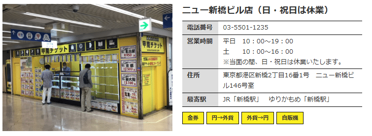 | 新橋チケット | 平日10:00~19:00 | 土日祝 | 新幹線回数券専門 | 新幹線に特化・法人対応可 |